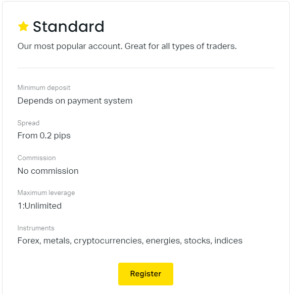 标准账户是初学者的最佳解决方案,他们还没有准备好进行大额最低存款,也不知道如何进行大额交易。我们想提醒您,协议类型可以随时更改,因此最好先在标准版本的账户中投资。