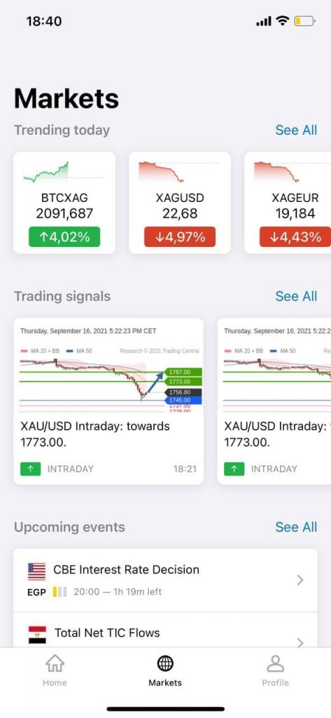 1. 主页应用程序的主页面显示了所有可用交易工具的图表。您可以选择您最喜欢的工具或其中一个类别,例如金属或加密货币。此外,您还可以看到您的账户余额。